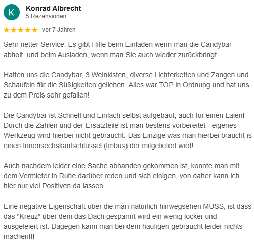 Ich unterstütze euch zuverlässig bei allen Fragen rund um die Vermietung und helfe euch bei der Auswahl der passenden Mietartikel. Ihr erreicht mich jederzeit unkompliziert per E-Mail oder telefonisch.
