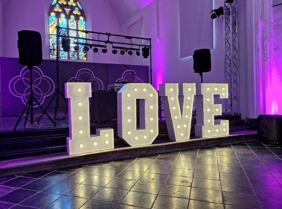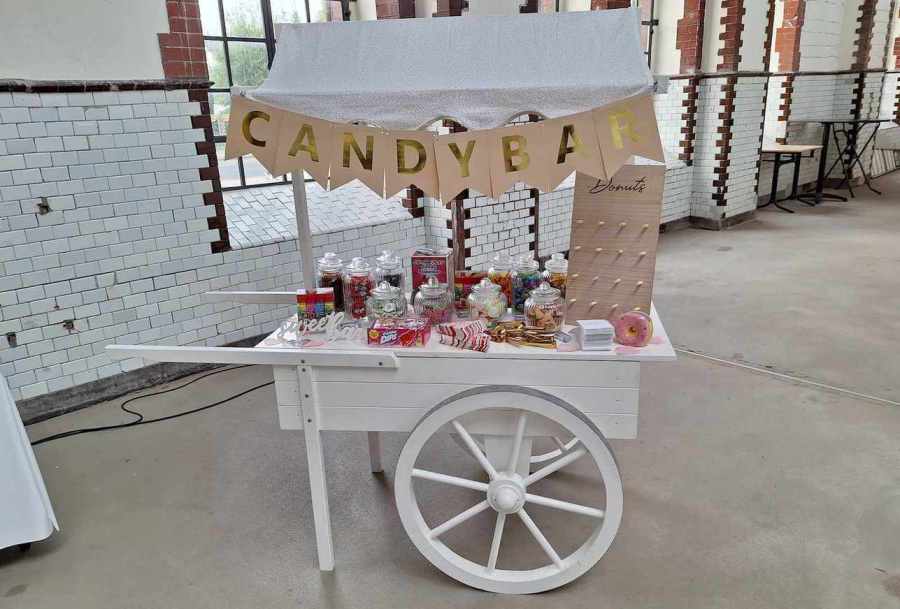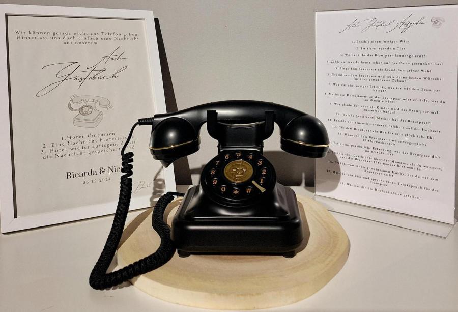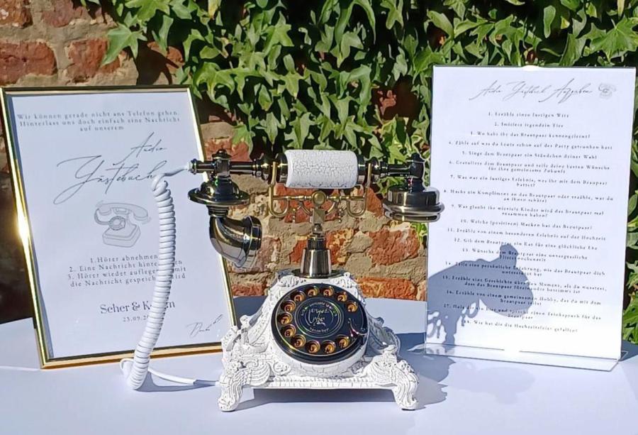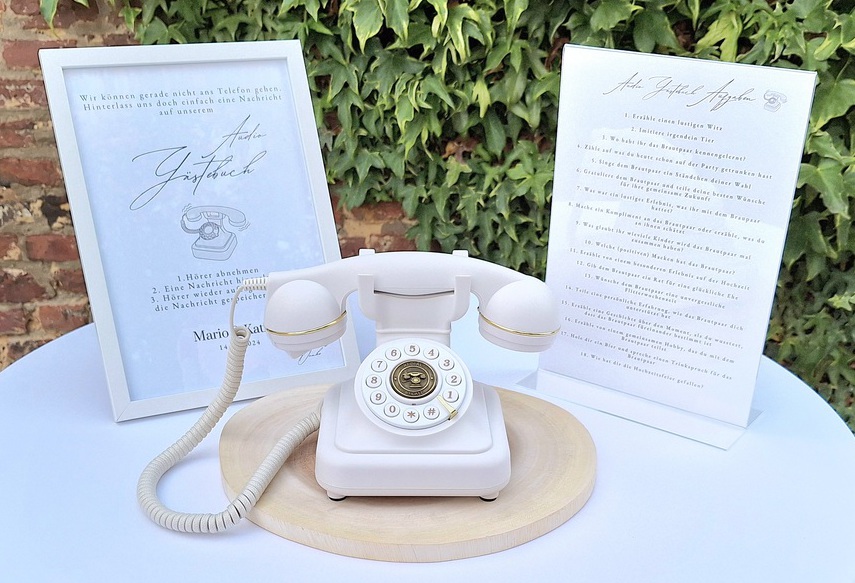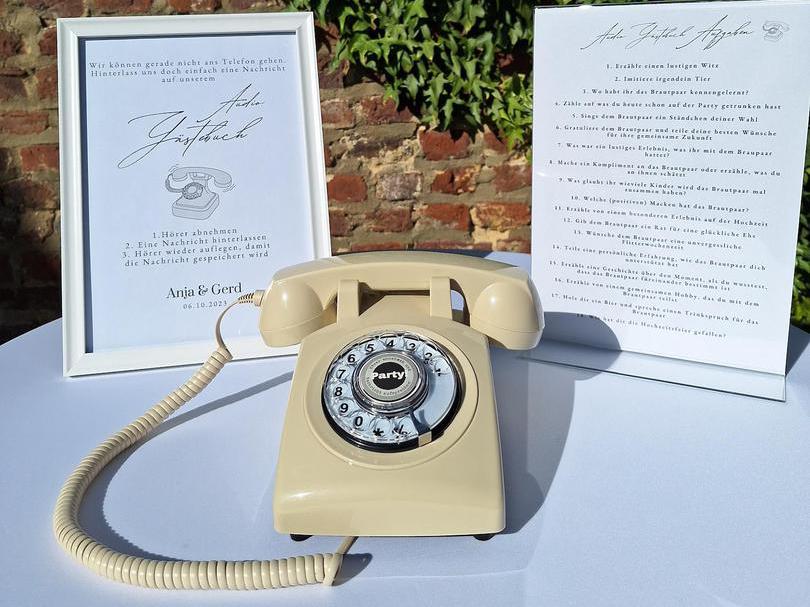Die Fotobox „Karlsknipse“ sorgt für bleibende Erinnerungsfotos, stilvolle Love-Buchstaben setzen besondere Akzente, ein Audio-Gästebuch im Telefon-Design hält persönliche Botschaften fest, ein Candybar-Wagen bietet süße Highlights und ein eleganter Traubogen schafft den passenden Rahmen für eure Feier.