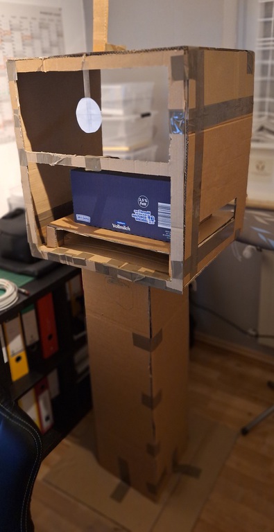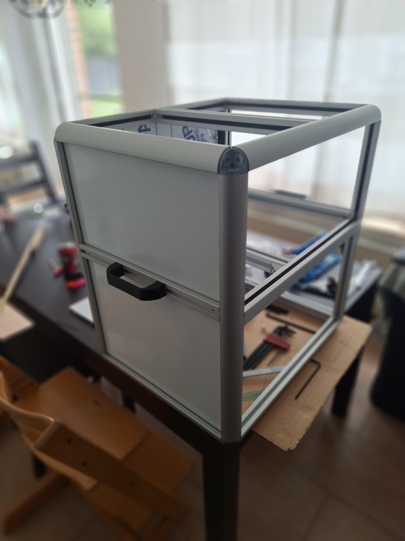 Um das zu testen, habe ich eine technische Zeichnung der Aluprofile erstellt und anschließend sogar einen kompletten 1:1-Dummy der gesamten Fotobox aus Pappe gebaut. Mit diesem Modell konnte ich genau prüfen, ob alle Bauteile ihren Platz finden, ob genügend Luftzirkulation vorhanden ist und wie die spätere Bedienung aussehen wird. Das war ein entscheidender Schritt, um das finale Maß und den Aufbau perfekt festzulegen.