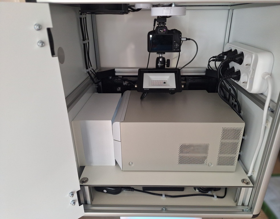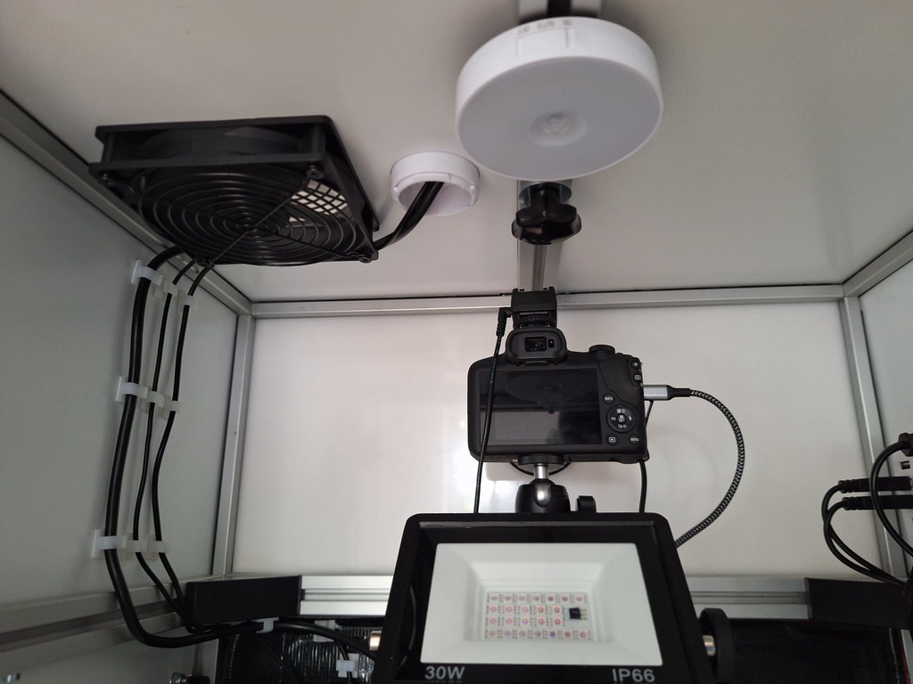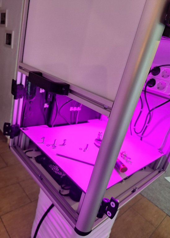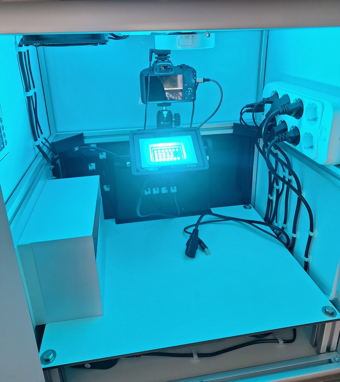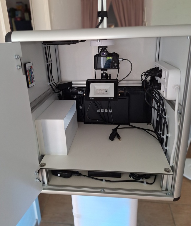 An der Front habe ich eine transparente Acrylglasplatte verbaut, die ebenfalls von einer LED-Leuchte von innen beleuchtet wird. Durch diese Platte blickt auch die Canon Mirrorless Kamera, die das