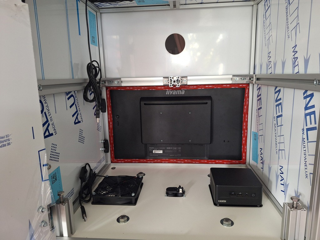 Im Inneren arbeitet ein schneller Nuc Mini-PC, auf dem die Software DSLR Booth läuft. Diese steuert die Kamera, den Bildschirm und den Drucker – alles perfekt