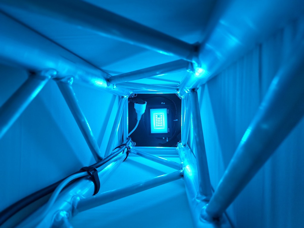 Auf der HPL-Bodenplatte steht eine mehrfarbige LED-Leuchte, die die Husse in unterschiedlichen Farben anstrahlt – alles bequem über Fernbedienung steuerbar.
