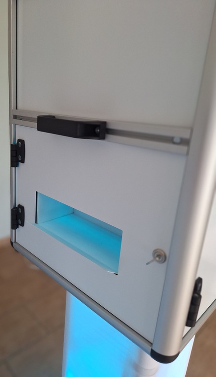 Das Gehäuse besteht aus passgenau gefertigten Aludipond-Platten, die für Stabilität und ein modernes Design sorgen. Zwei Türen mit Scharnieren ermöglichen den Zugang zum
