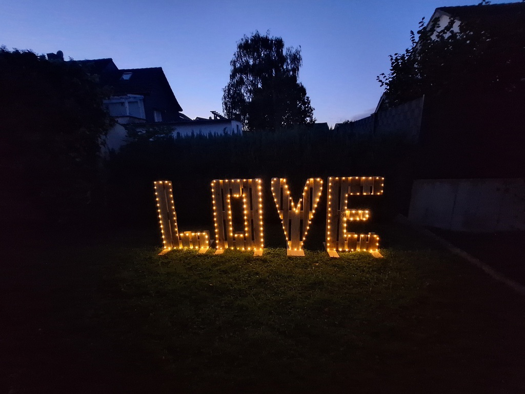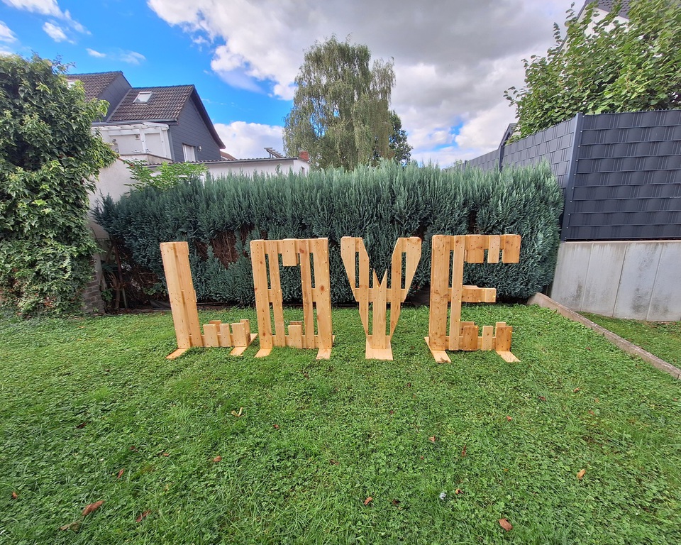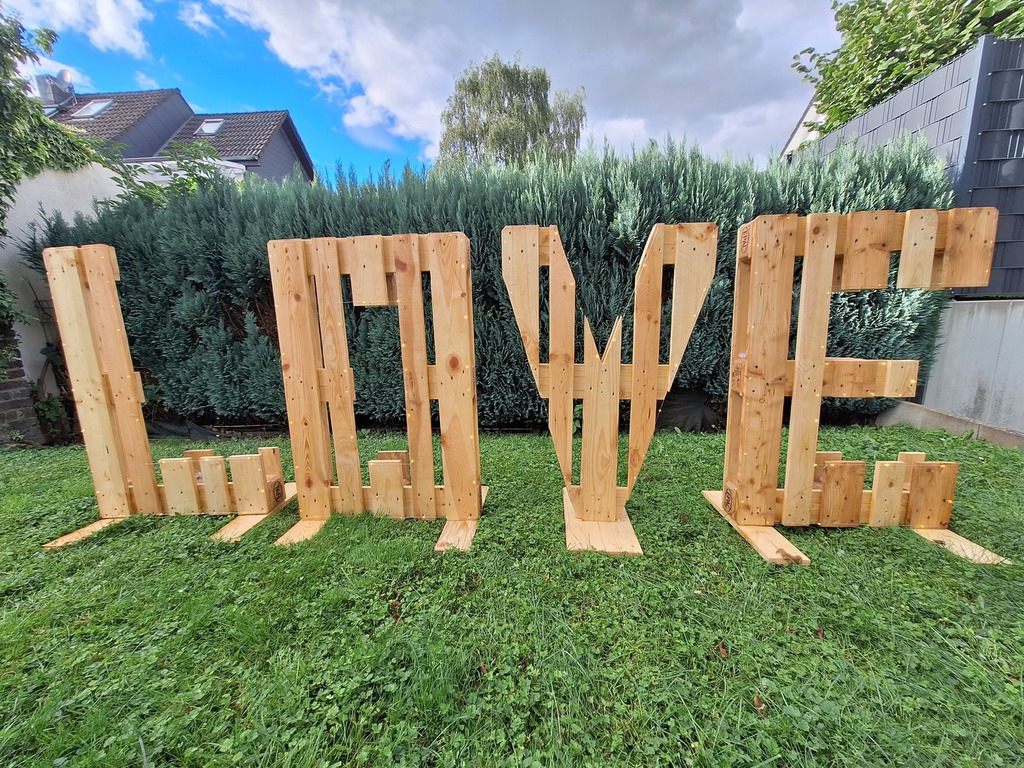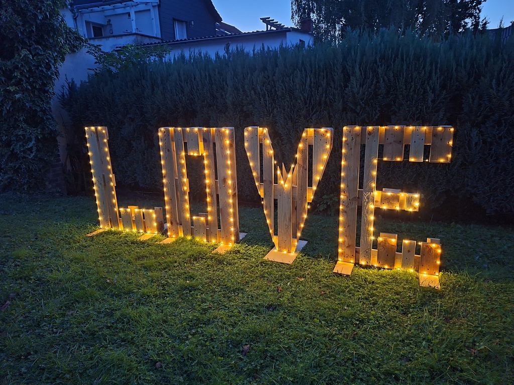 Mieten Sie unsere in liebevoller Handarbeit gefertigten Love Buchstaben aus Europaletten. Das Highlight der Buchstaben sind die verbauten LED-Beleuchtungen, die die Buchstaben auch im Dunkeln besonders in Szene setzen.